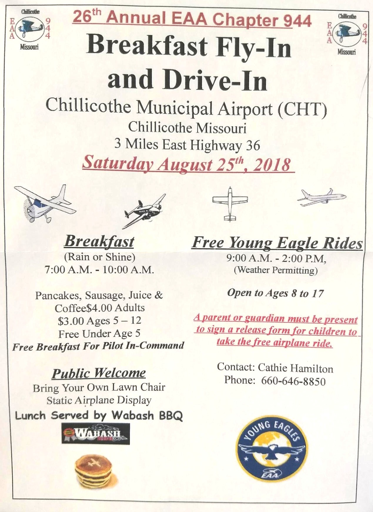 | Saturday | Aug 25 | CHT | Chillicothe Pancake Breakfast (EAA 944)(Chillicothe Municipal Airport MO) | 7:00-10:00 | 59 |