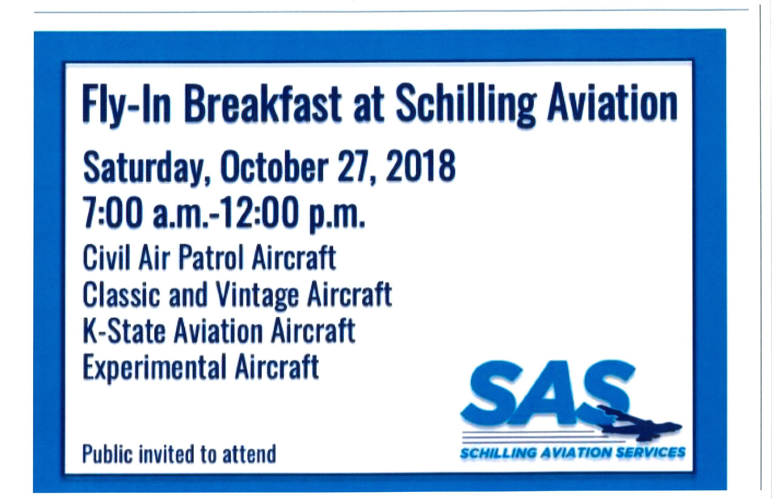 | Saturday | Oct 27 | SLN | Schilling Aviation Fly-in Breakfast (Salina Regional Airport, Salina KS) | 7:00-12:00 | 181 |